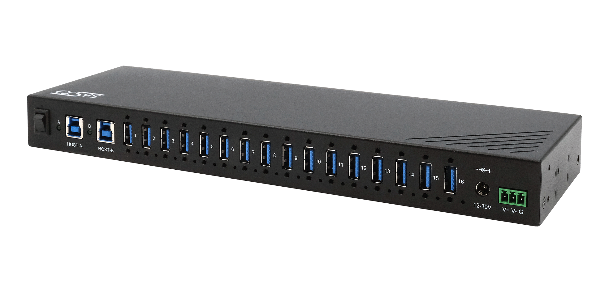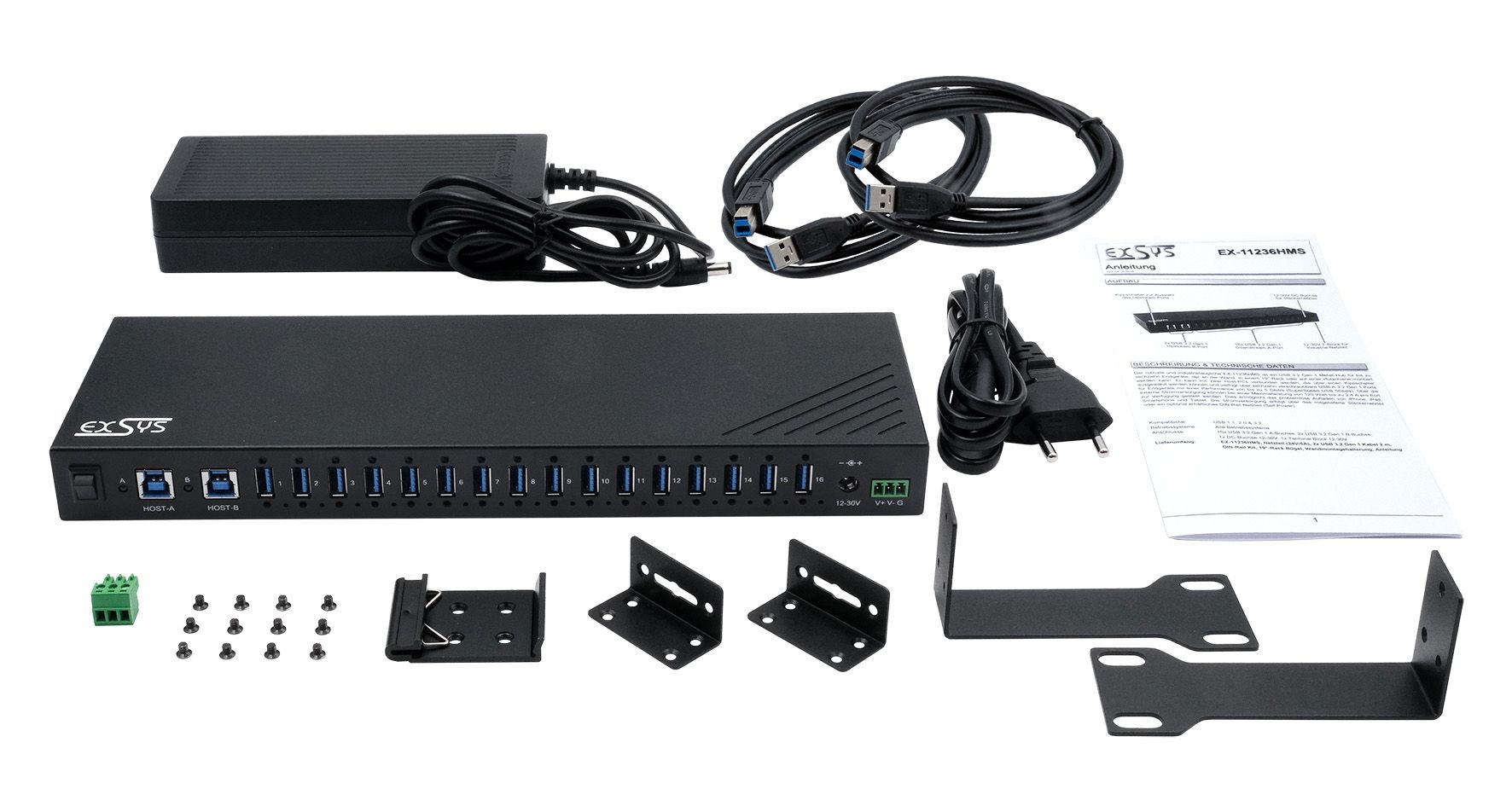 Der robuste und industrietaugliche EX-11236HMS ist ein USB 3.2 Gen 1 Metall-Hub für bis zu sechzehn Endgeräte, der an der Wand, in einem 19"-Rack oder auf einer Hutschiene montiert werden kann. Er kann mit zwei Host-PCs verbunden werden, die über einen Kippschalter ausgewählt werden können und verfügt über sechzehn verschraubbare USB-A 3.2 Gen 1 Ports für Endgeräte mit einer Performance von bis zu 5 Gbit/s (SuperSpeed USB 5Gbps). Über die externe Stromversorgung können bei einer Maximalleistung von 120 Watt bis zu 2.4 A pro Port zur Verfügung gestellt werden. Dies ermöglicht das problemlose Aufladen von iPhone, iPad, Smartphone und Tablet. Die Stromversorgung erfolgt über das mitgelieferte Steckernetzteil oder ein optional erhältliches DIN-Rail Netzteil (Self-Power).