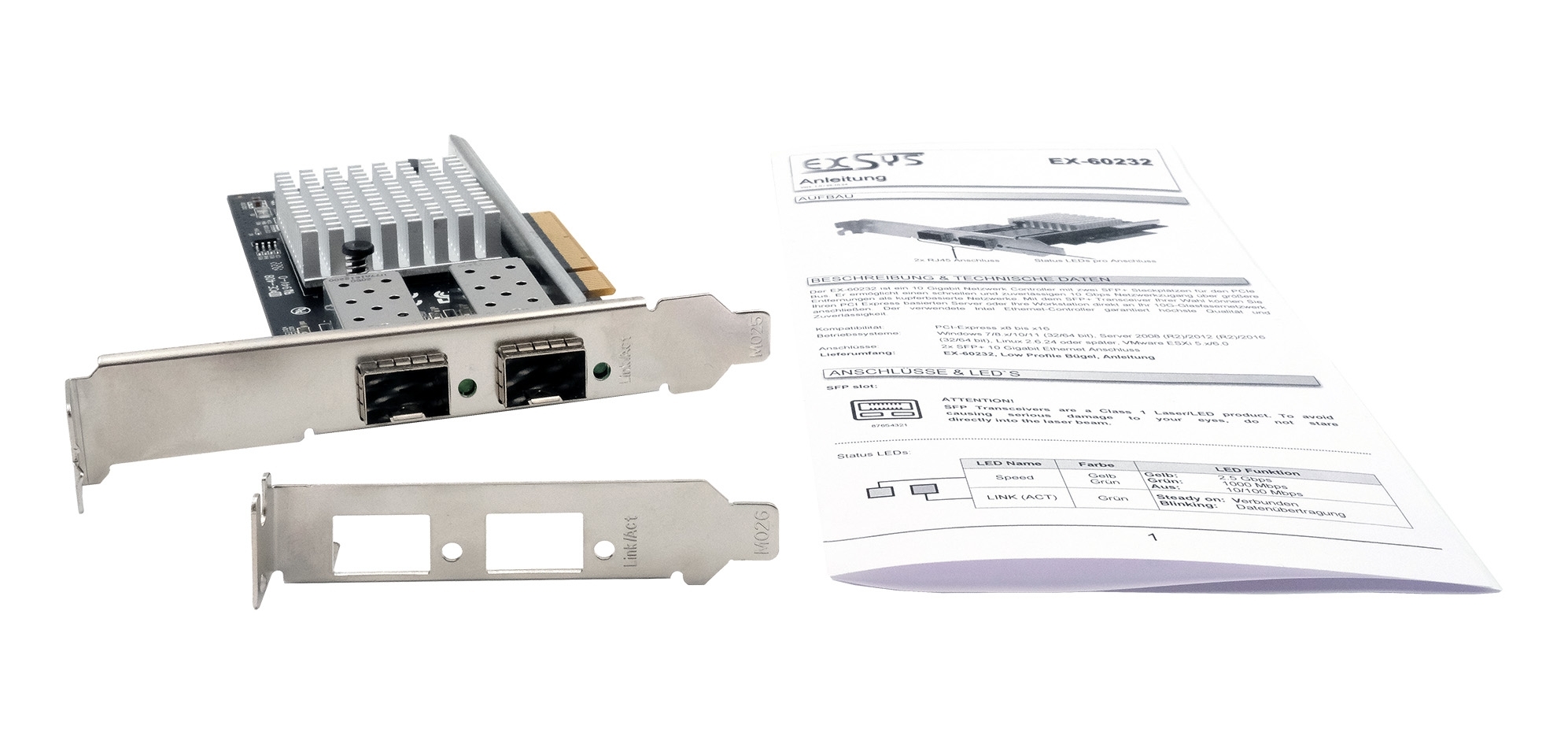 Der EX-60232 ist ein 10 Gigabit Netzwerk Controller mit zwei SFP+ Steckplätzen für den PCIe Bus. Er ermöglicht einen schnellen und zuverlässigen 10 Gbps Netzwerkzugang über größere Entfernungen als kupferbasierte Netzwerke. Mit dem SFP+ Transceiver Ihrer Wahl können Sie Ihren PCI Express basierten Server oder Ihre Workstation direkt an Ihr 10G-Glasfasernetzwerk anschließen. Der verwendete Intel Ethernet-Controller garantiert höchste Qualität und Zuverlässigkeit.