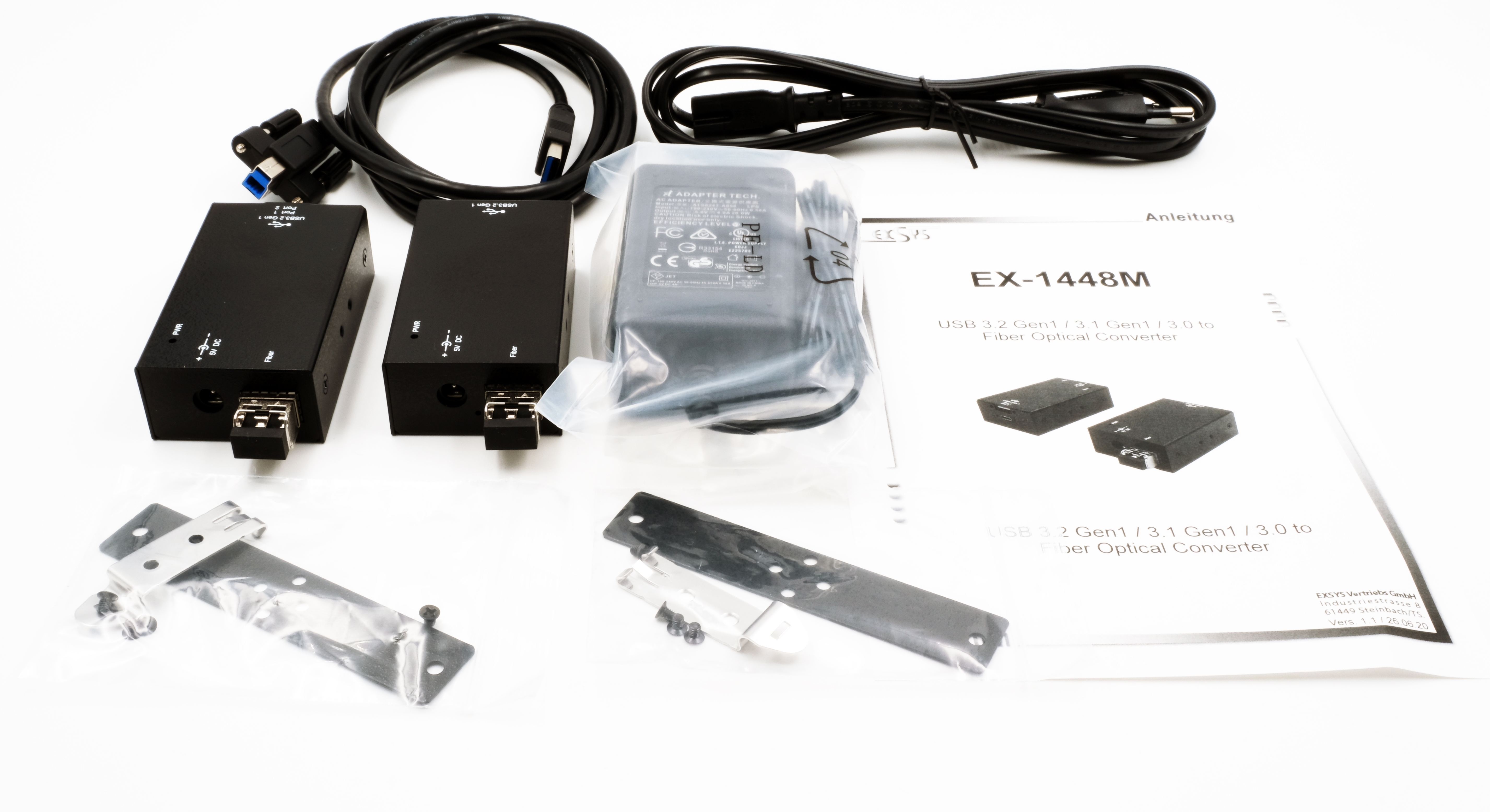 1x Sender und 1x Empfänger, USB 3.2 Gen 1 Kabel A-zu-B 1.5 m, Wandmontage– und DIN-Rail Kit, Netzteil 5V/4A, Handbuch