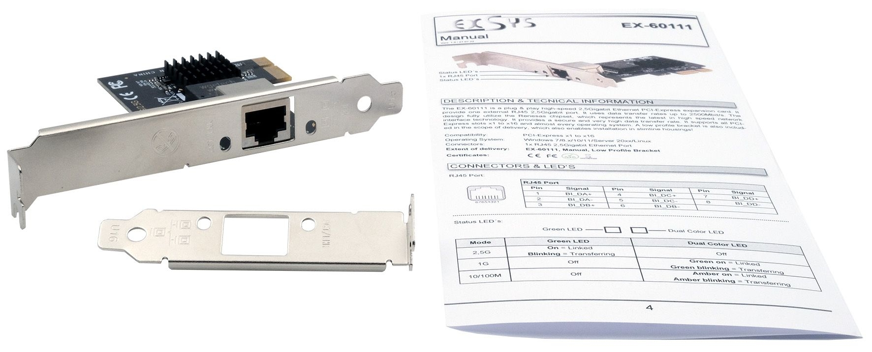 Die EX-60111 ist eine 2.5 Gigabit Ethernet Karte für den PCIe Bus. Sie unterstützt Half und Full Duplex sowie NWay Auto-Negotation, um sich automatisch an die Geschwindigkeit im Netzwerk (10/100/1000/2500 Mbit/s.) anzupassen. Weiterhin ist die Karte mit Auto-MDI/MDI-X ausgestattet und bietet sie eine weitreichende Unterstützung von diversen Betriebssystemen. Mit der Karte wird ein Low Profile Bügel mitgeliefert zum Einbau in ein schmales PC Gehäuse.
