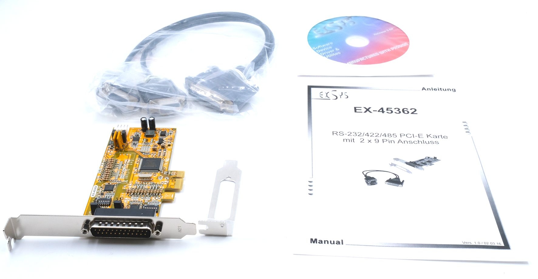 Die EX-45362 PCIe I/O-Karte stellt zwei serielle RS-232, 422 und 485 High Performance UART 16C550 Ausgänge zur Verfügung. Jeder Port kann unabhängig als RS-232, 422 oder 485 konfiguriert werden. Sie wurde entwickelt um zwei weitere serielle Combo Ports für PC, Workstation oder Server über den PCIe Bus zu erweitern. Die Karte ist voll PCIe Plug-and-Play kompatibel und hat keine Konflikte mit IRQ und I/O Adressen. Sie unterstützt die Merkmale ATTA Auto RS-485 Transmitter. Zusätzlich ist +5V oder +12V auf Pin 9 des seriellen RS-232 Steckers konfigurierbar für ein POS System (Power over System). Mit der Karte wird ein Low Profile Bügel für schmale PC Gehäuse mitgeliefert.