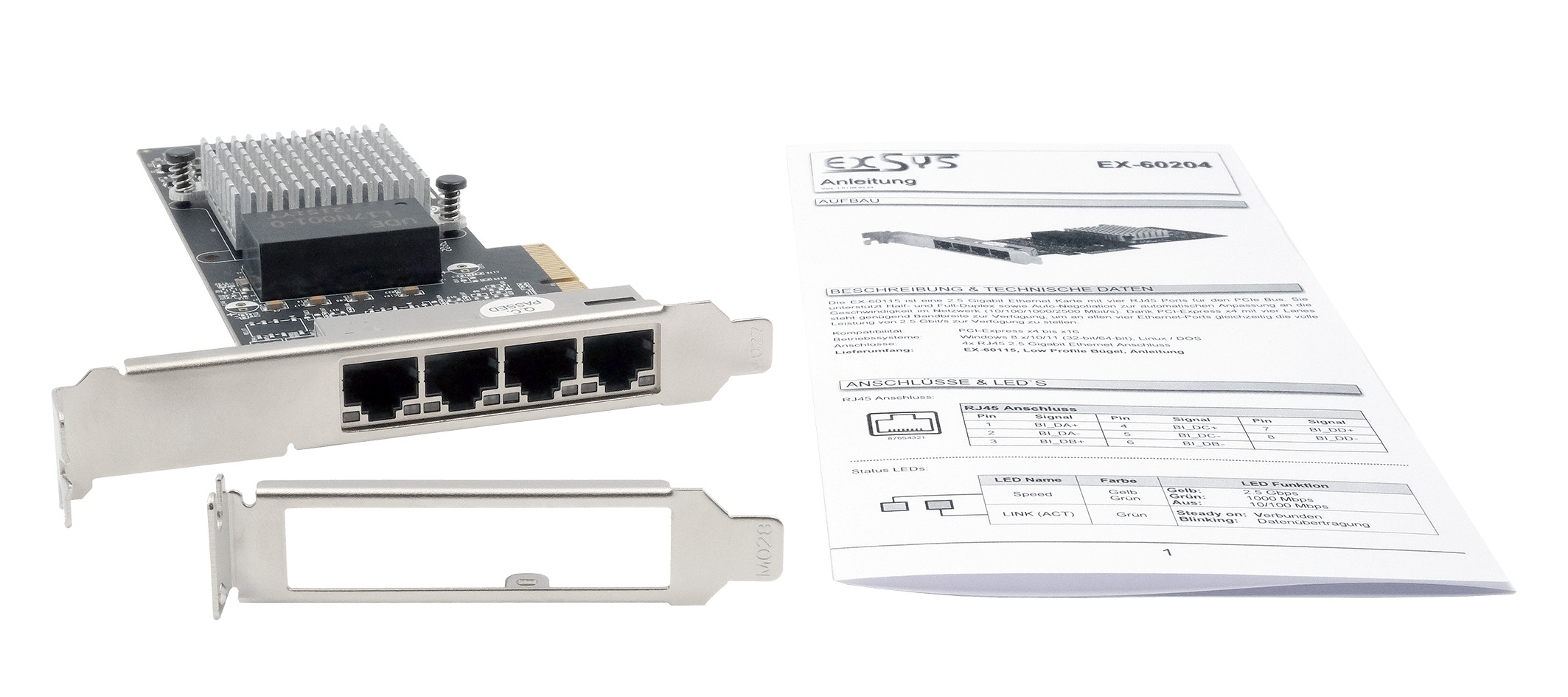 Die EX-60204 ist eine 1 Gigabit Ethernet Karte mit vier RJ45 Ports für den PCIe Bus. Sie unterstützt Half- und Full-Duplex sowie Auto-Negotiation zur automatischen Anpassung an die Geschwindigkeit im Netzwerk (10/100/1000 Mbit/s). Der verwendete Intel Ethernet-Controller garantiert höchste Qualität und Zuverlässigkeit.