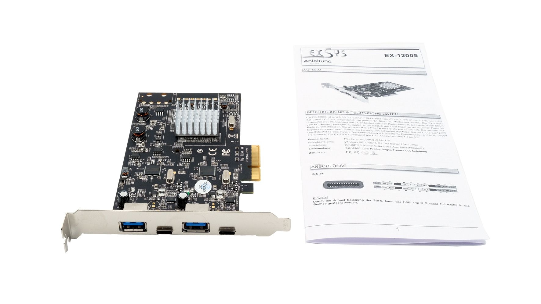 Die EX-12005 USB 3.2 Gen 2x1 mit PCIe Slot (Gen3x4) Karte stellt vier externe Super-Speed+ USB 3.2 Gen 2x1 Ports mit 2x USB-A und 2x USB-C Buchse zur Verfügung. Sie wurde entwickelt um vier weitere USB 1.1, 2.0, 3.0 und 3.2 Gen 2 Endgeräte an Ihre Workstation, Desktop oder Server anzuschliessen. Sie unterstützt USB 1.1 Low-Speed (1.5 mbps), Full-Speed (12Mpbs), USB 2.0 High-Speed (480Mbps), USB 3.0 Super-Speed (5Gbps) und USB 3.2 Gen 2x1 Super-Speed+ (10Gbps) und ist die perfekte Technologie für externe Speicher, Digitale Kameras, Webcam, Scanner und mehr. Die EX-12005 unterstützt 3.0A Strom an den externen USB 3.2 Gen 2x1 Ports mit USB-C Anschluss.