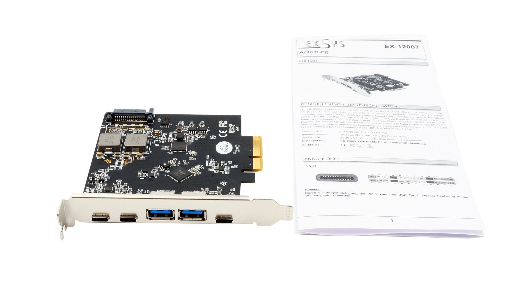 Die EX-12007 USB 3.2 Gen 2x1 Karte mit PCIe Slot (Gen3, x4) stellt fünf Externe USB 3.2 Gen 2x1 Ports mit 2x USB-A und 3x USB-C Anschlüssen zur Verfügung. Sie wurde entwickelt um fünf weitere USB-Endgeräte an Workstation, Desktop oder Server anzuschliessen. Sie unterstützt USB 3.2 Gen 2x1 SuperSpeed 10Gbps und ist abwärtskompatibel zu früheren USB-Versionen. Die EX-12007 ist die perfekte Erweiterung zum Anschluss moderner Peripheriegeräte wie externe Speicher, Kameras, Webcams, Scanner und mehr. Sie unterstützt Battery Charge 1.2 an den USB-A Anschlüssen und bis zu 3 A Ladestrom an den USB-C Anschlüssen.