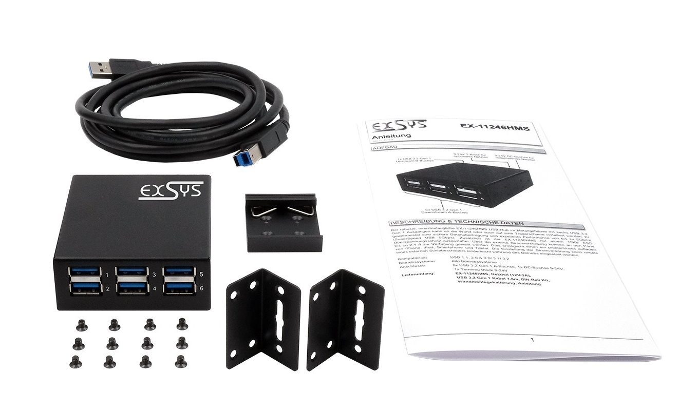 EX-11246HMS, USB 3.2 Gen 1 Kabel 2m, DIN-Rail Kit, Wandmontagehalterung, Anleitung