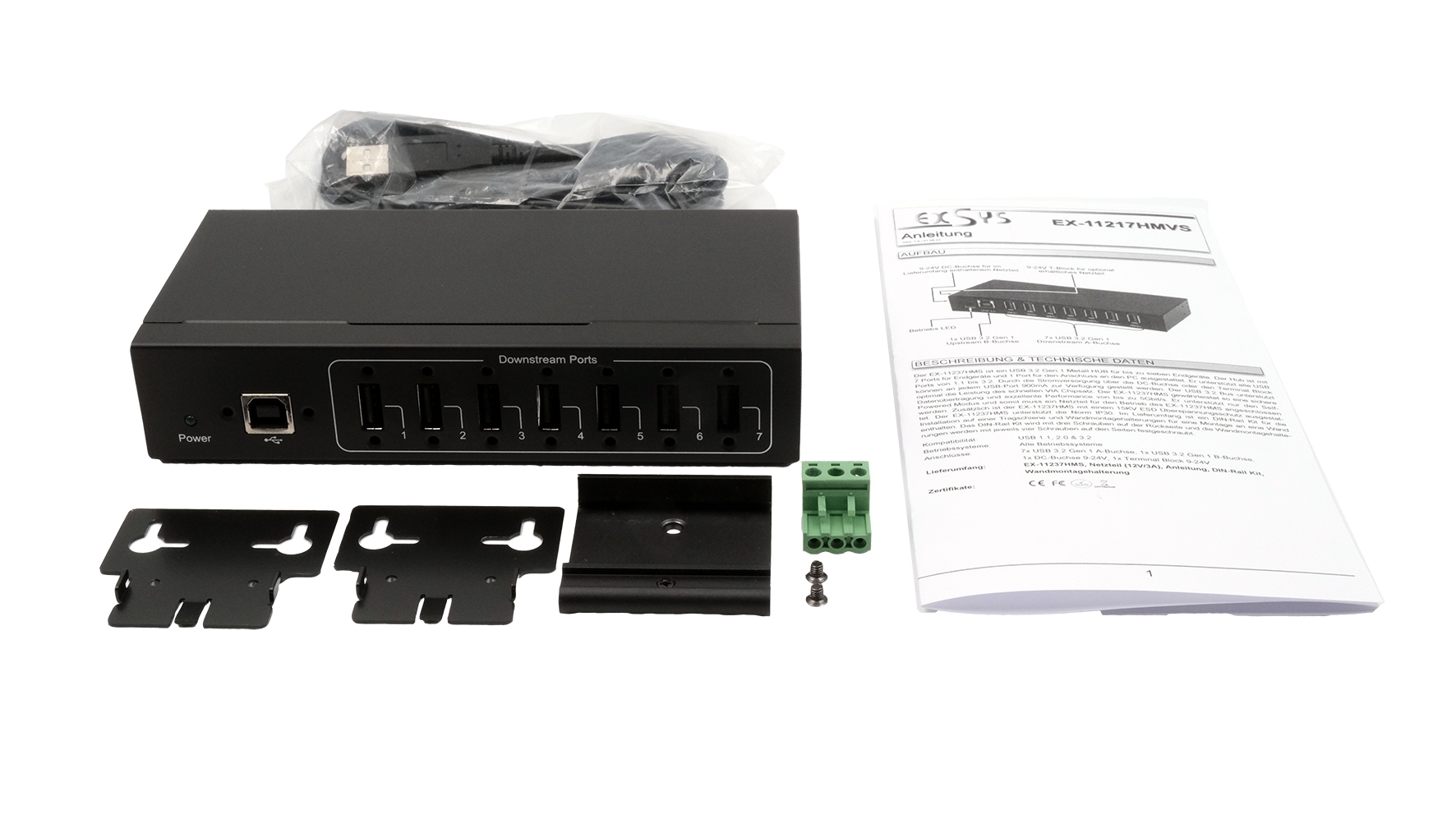 EX-11217HMVS, USB 2.0 Kabel 2.0 m, Steckernetzteil 5V/4A, DIN-Rail Kit, Wandmontage Kit, Handbuch