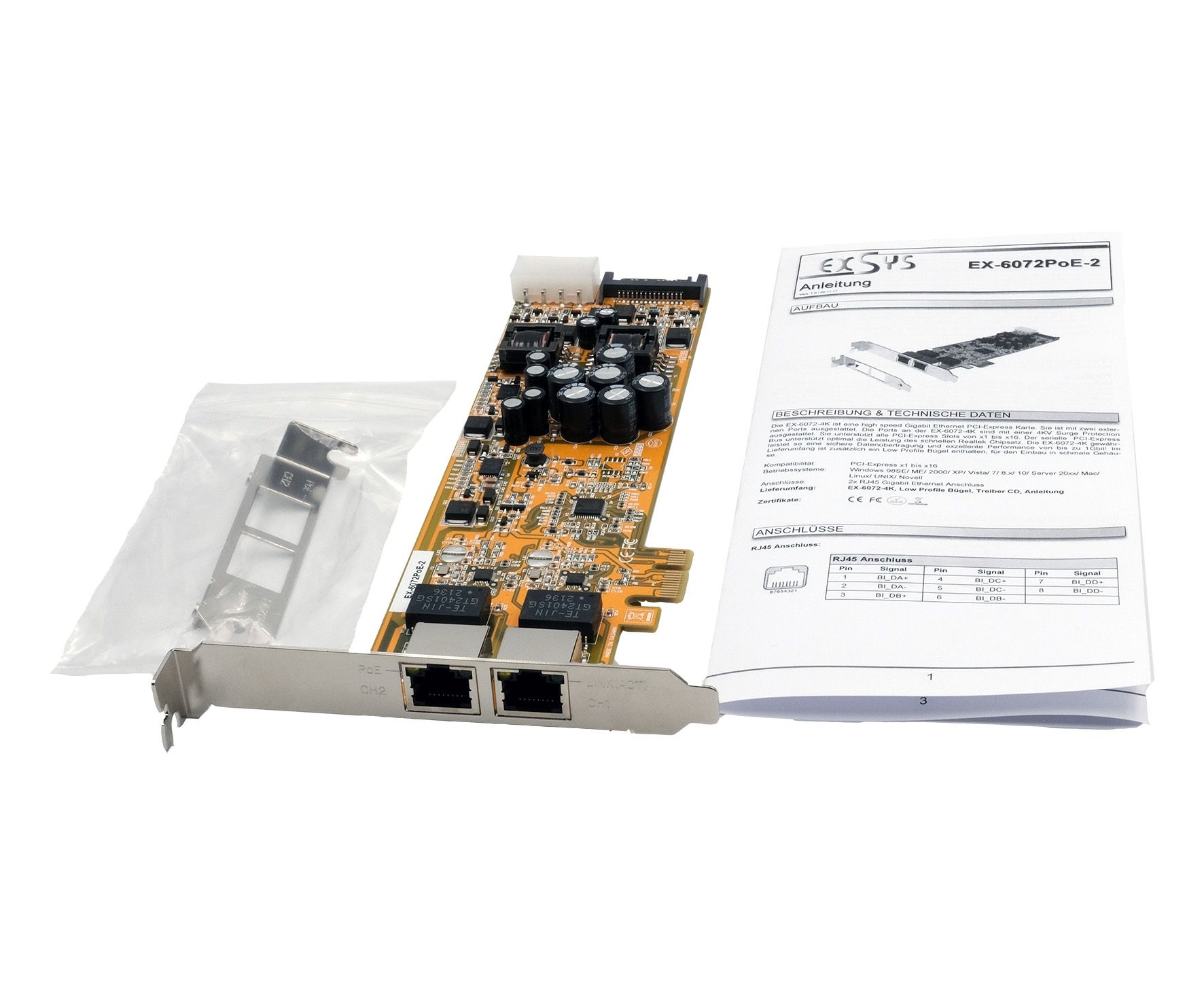 Die EX-6072PoE-2 ist eine schnelle 1 Gigabit Ethernet Karte mit zwei RJ45 Anschlüsse, entwickelt für den PCIe (x1) Bus. Die EX-6072PoE-2 unterstützt Power over Ethernet und eine Datenübertragungsrate von bis zu 1000 Mbit pro Sekunde. Der PCI-Express Bus unterstützt optimal die Leistung des schnellen Realtek Chipsatz und somit wird eine sichere Datenübertragung und exzellente Performance garantiert. Jeder Anschluss hat einen eigenen Realtek Chipsatz und somit können größere Datenmengen schneller und effizienter im Netzwerk übertragen werden. Die EX-6072PoE-2 unterstützt Half und Full Duplex sowie NWay Auto-Negotation, um sich an die Geschwindigkeit im Netzwerk (10/100/1000 Mbit/s.) automatisch anzupassen. Weiterhin ist die Karte mit Auto-MDI/MDI-X ausgestattet. Außerdem bietet sie eine sehr weitreichende Unterstützung von diversen Betriebssystemen. An die EX-6072PoE-2 können ohne zusätzliche PoE-Switches oder PoE-Injektoren, jegliche Endgeräte die Power over Ethernet unterstützen angeschlossen werden. Mit der Karte wird ein Low Profile Bügel mitgeliefert zum Einbau in ein schmales PC Gehäuse.
