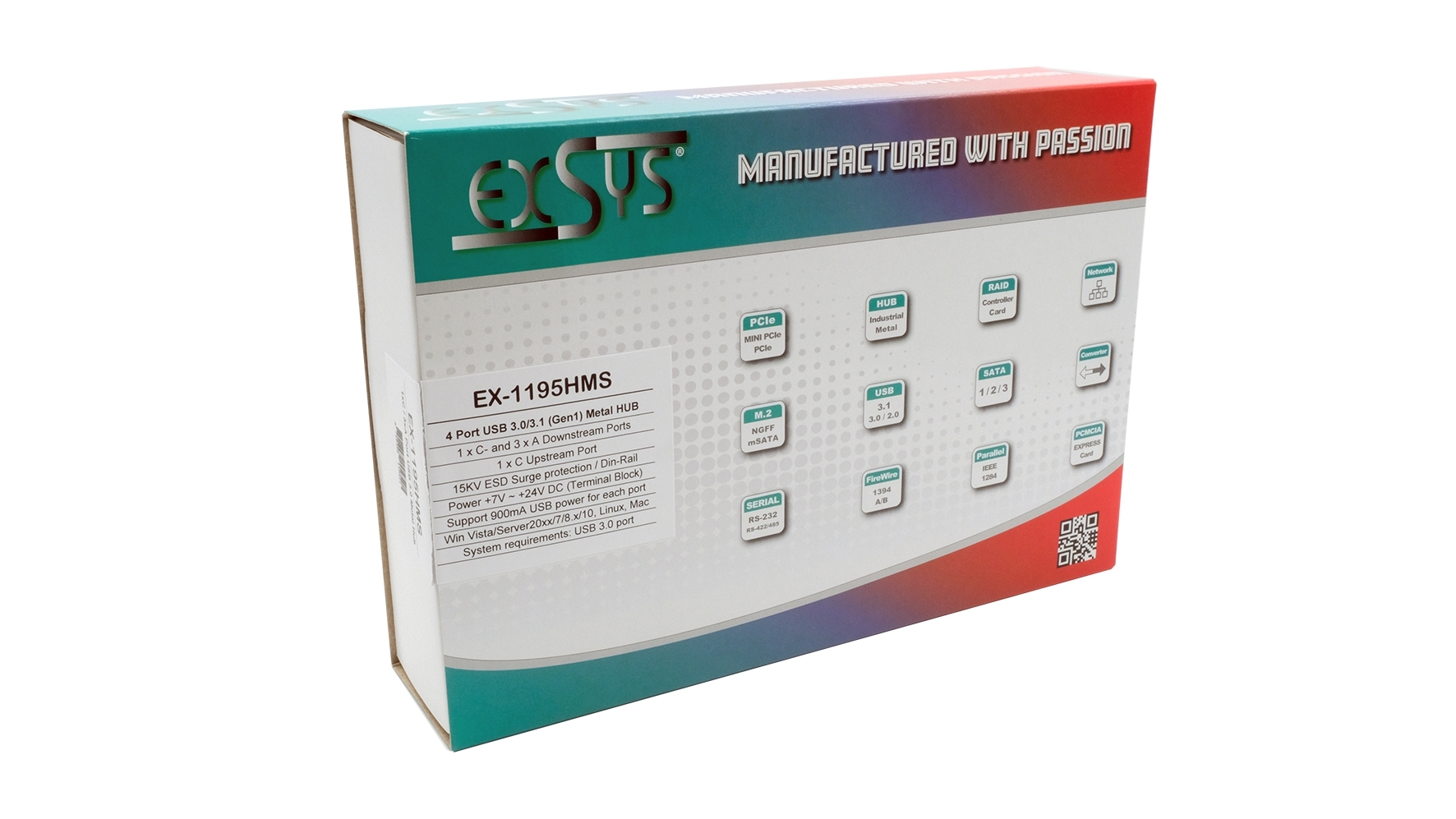 The EX-1195HMS is a USB 3.2 Gen 1 (previously called 3.0) metal HUB that complies with Universal Serial Bus (USB) Revision 3.2 Gen 1 specifications and operates at data speeds up to 5Gbps. It offers one USB-C upstream port and 4 downstream ports with one USB-C and three USB-A ports. The EX-1195HMS supports 15KV ESD surge protection for each port. Port 1 is equipped with one USB-C connector. It is thus possible to connect up to four external USB peripherals to one USB 3.2 Gen 1 port from the computer in the 19" rack. The HUB meets the special requirements of industrial applications.