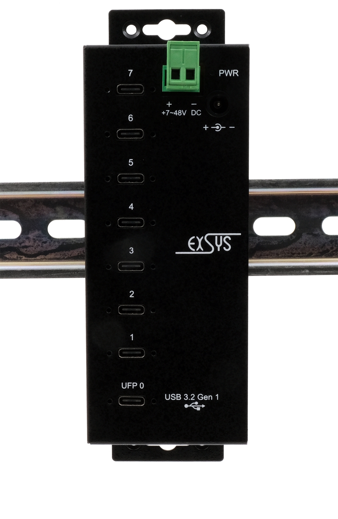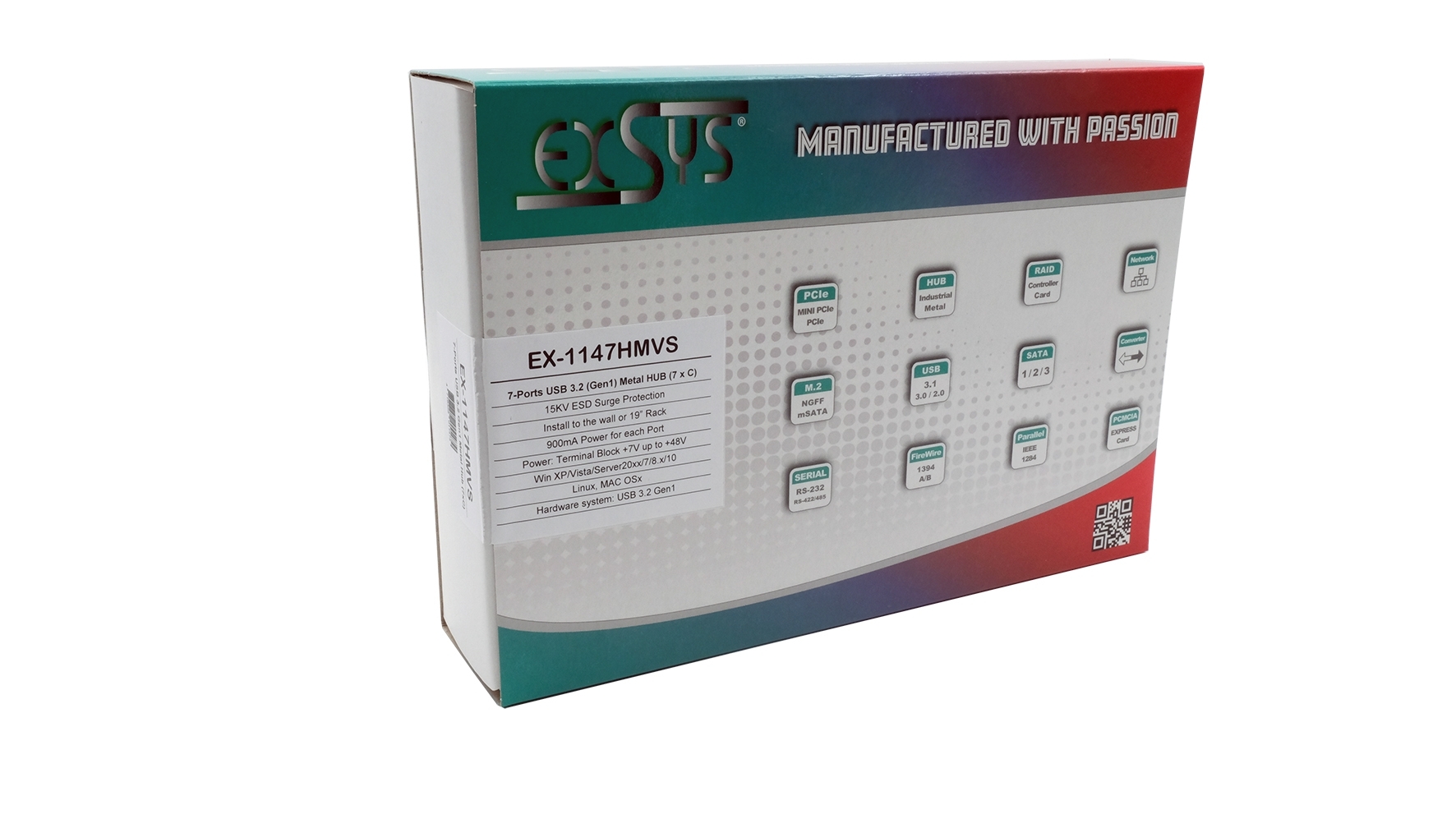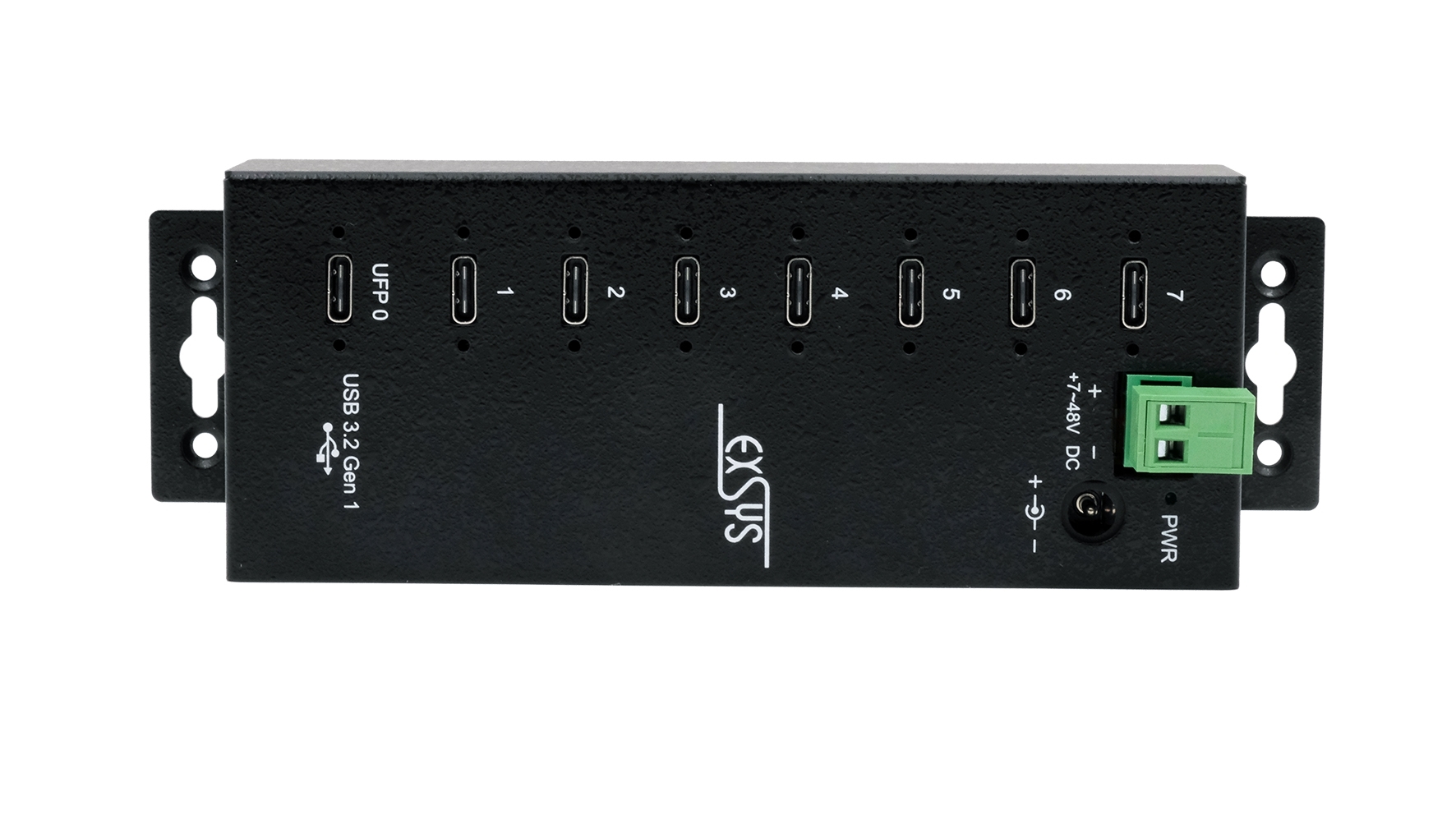 The rugged, industrial-grade EX-1147HMVS metal hub provides seven bolt-on USB 3.2 Gen 1 downstream ports with 15KV ESD surge protection. It is thus possible to connect up to seven external USB peripherals to one USB 3.2 Gen 1 port from the computer in a 19" rack. It supports SuperSpeed USB 3.2 Gen 1 data transfer rate of up to 5Gbps and is backward compatible to USB 1.1. The included USB 3.2 Gen 1 cable can be attached to the EX-1147HMVS with thumbscrews without a screwdriver. The EX-1147HMVS can be powered with USB bus power, via a DC Jack or a two-wire terminal block connector (+7V to +48V). The HUB meets the special requirements of industrial applications.