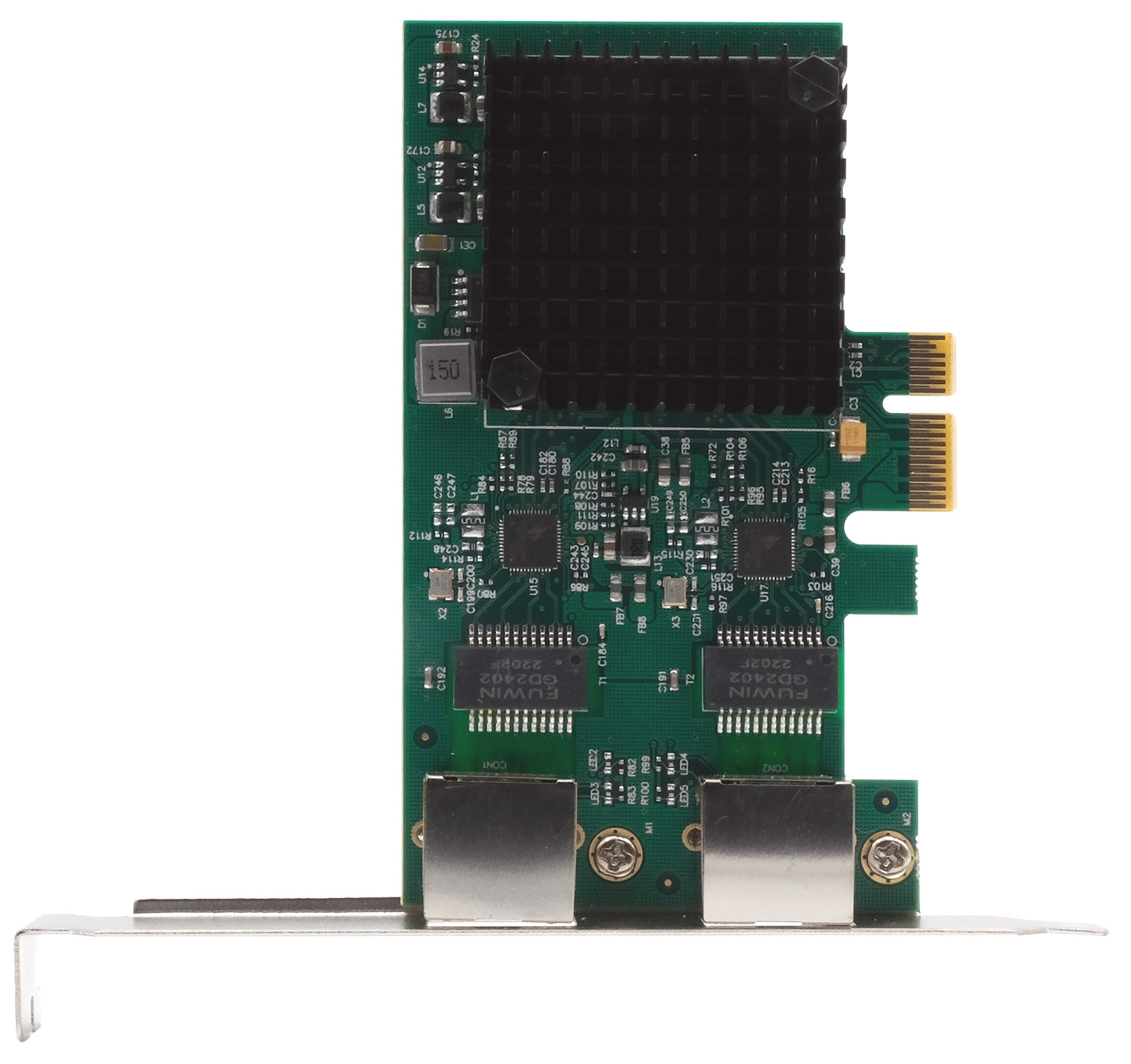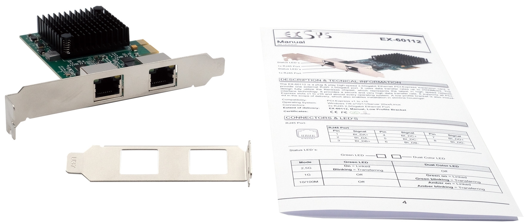 The EX-60112 is a 2.5 Gigabit Ethernet card with two RJ45-Ports for the PCIe bus. It supports Half and Full Duplex as well as NWay Auto-Negotiation to automatically adapt to the speed in the network (10/100/1000/2500 Mbit/s.). Furthermore, the card is equipped with Auto-MDI/MDI-X and offers extensive support for various operating systems. A low profile bracket is supplied with the card for installation in a narrow PC case.