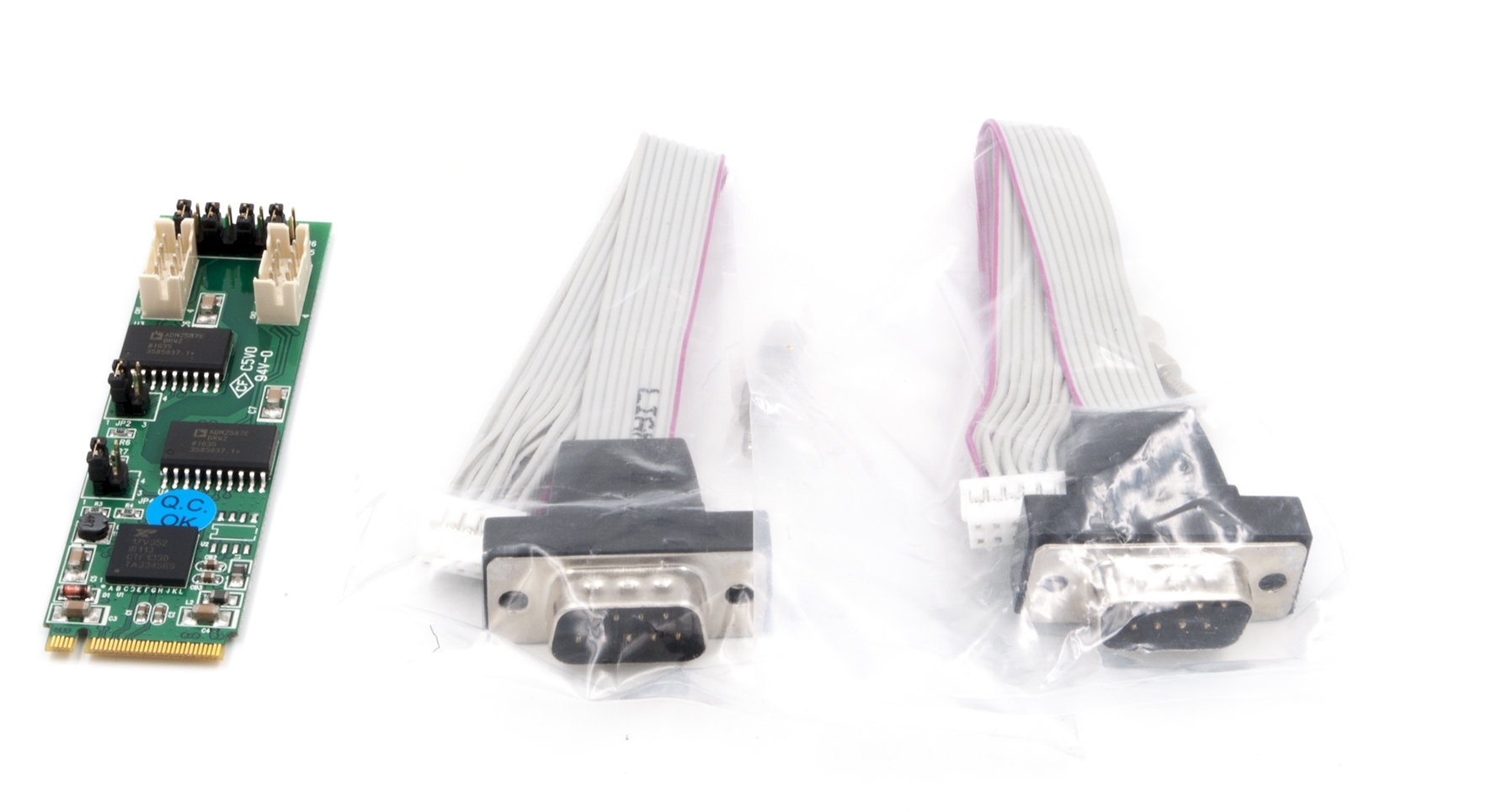 The EX-48210I RS-422/485 M.2 card is an internal expansion card with 2.5KV optical isolation for compact PCs, mainboards, notebooks and industrial use. Instead of the mSATA interface, the M.2 bus was developed and used under the Next Generation Form Factor (NGFF) designation. The EX-48210I supports two serial RS-422 and 485 high performance UART 16C550 outputs. It is designed to expand two additional serial ports via the M.2 (NGFF) bus. Included with the EX-48210I are two ribbon cables with 9 pin connectors for attachment to the device's chassis.