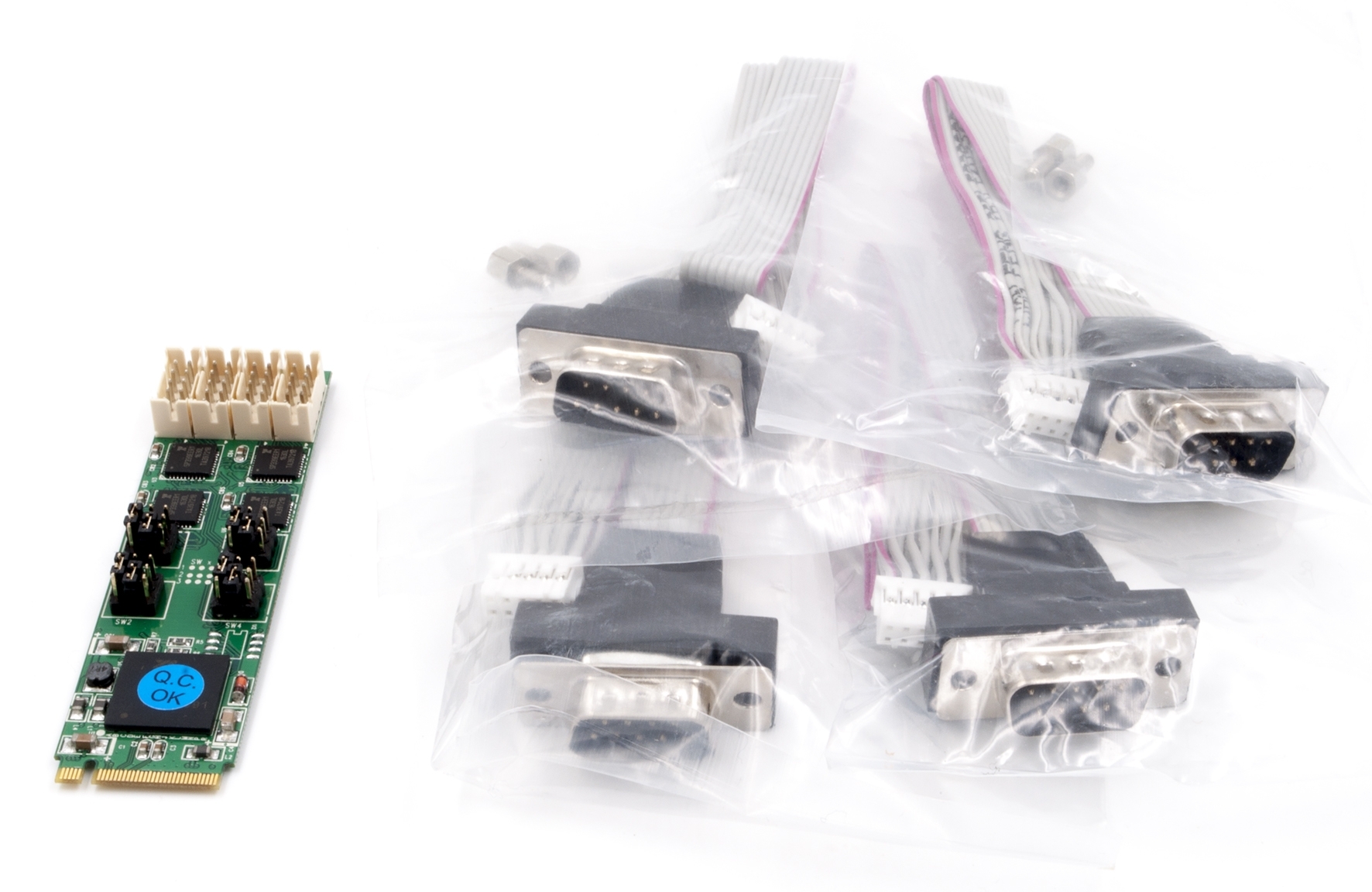 The EX-48240 RS-232/422/485 M.2 card is an internal expansion card for compact PCs, mainboards, notebooks and industrial use. Instead of the mSATA interface, the M.2 bus was developed and used under the Next Generation Form Factor (NGFF) designation. The EX-48240 supports four serial RS-232, 422 or 485 high performance UART 16C550 outputs. It is designed to expand four additional serial ports via the M.2 (NGFF) bus. Included with the EX-48240 are four ribbon cables with 9 pin connectors for attachment to the unit's chassis.