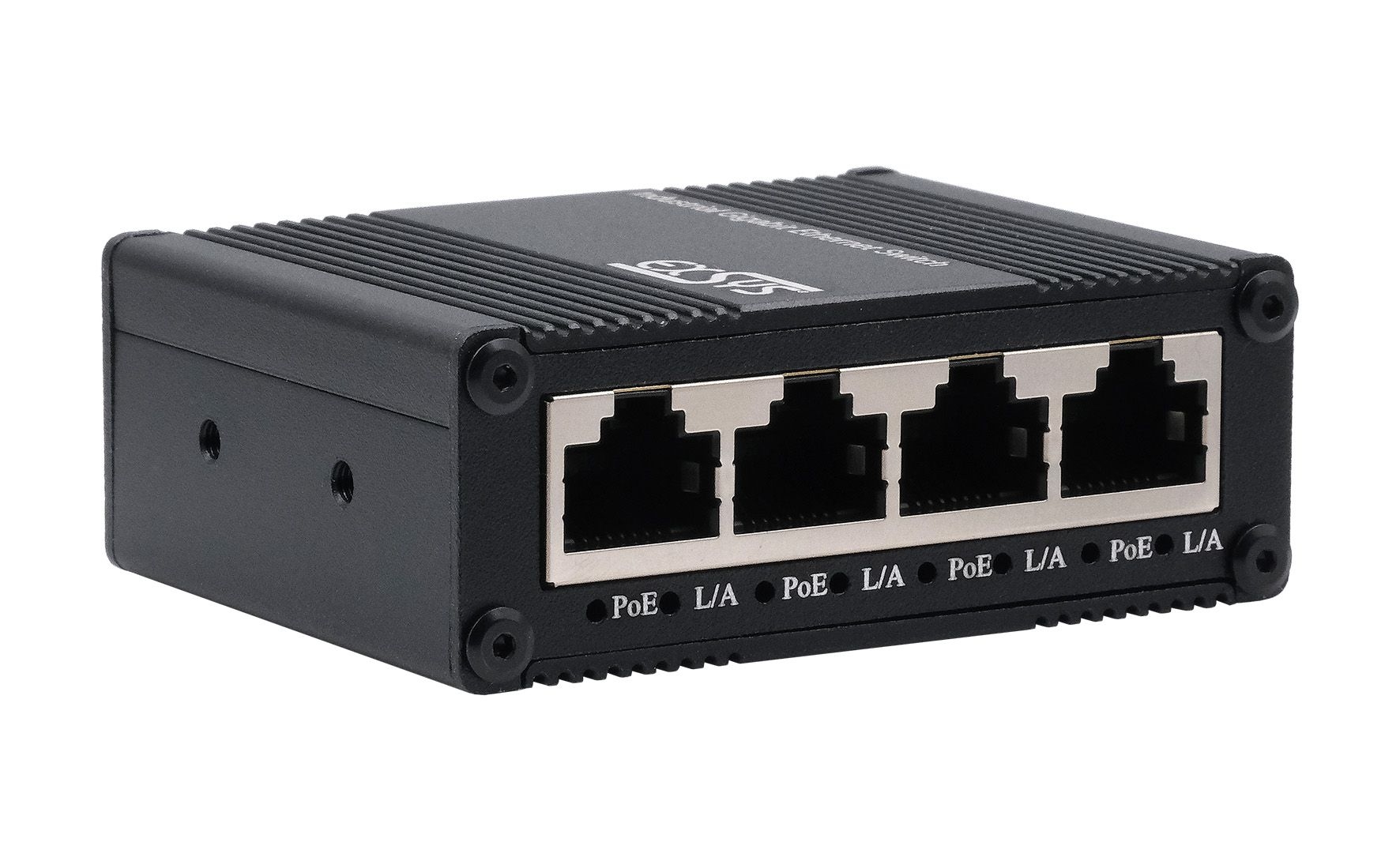 The EX-62021PoE-P is a tiny, industrial-grade 5-port Gigabit Ethernet switch with PoE pass-through. It delivers full Gigabit performance on all ports and reliably supplies up to four connected end devices with Power over Ethernet (PoE).