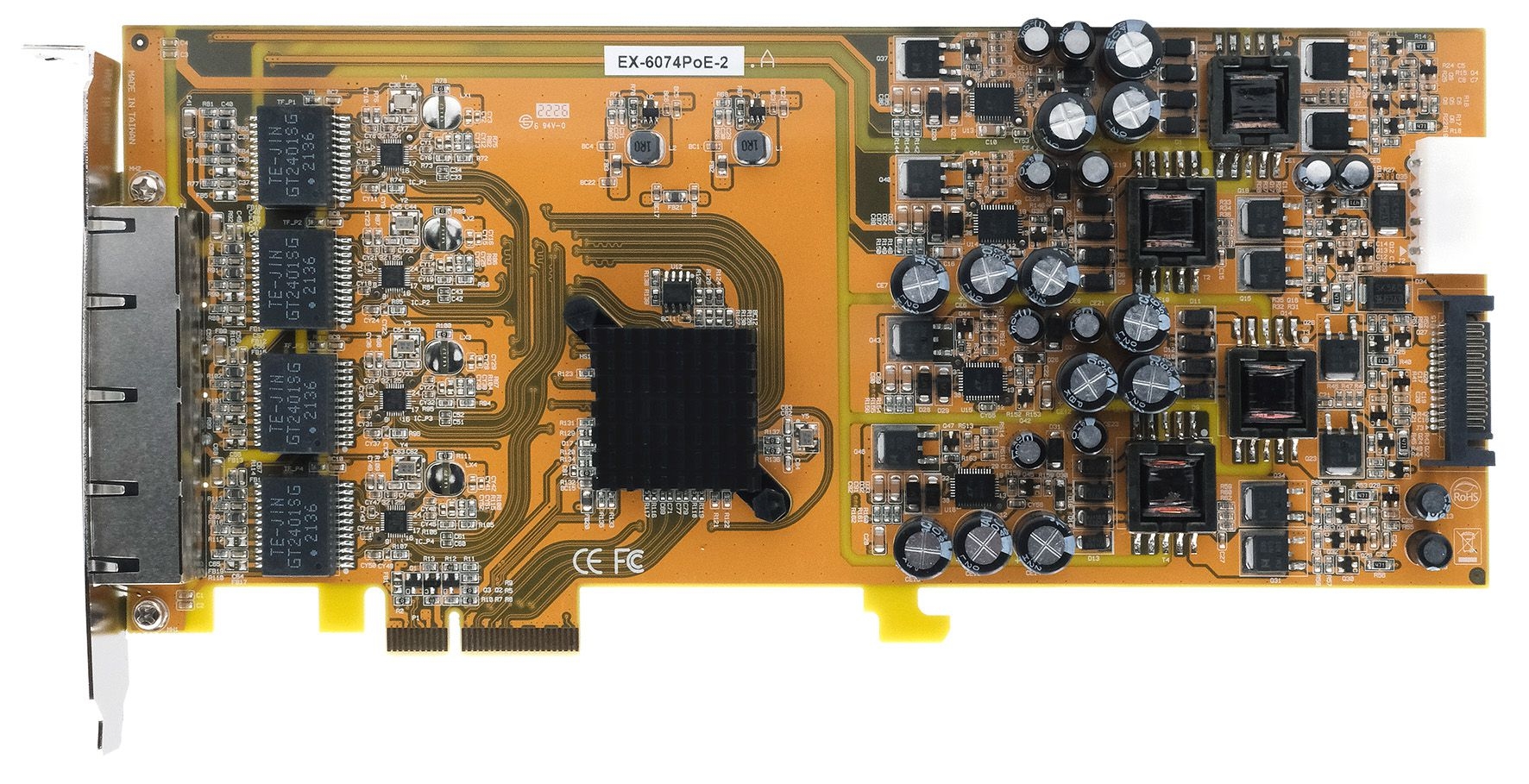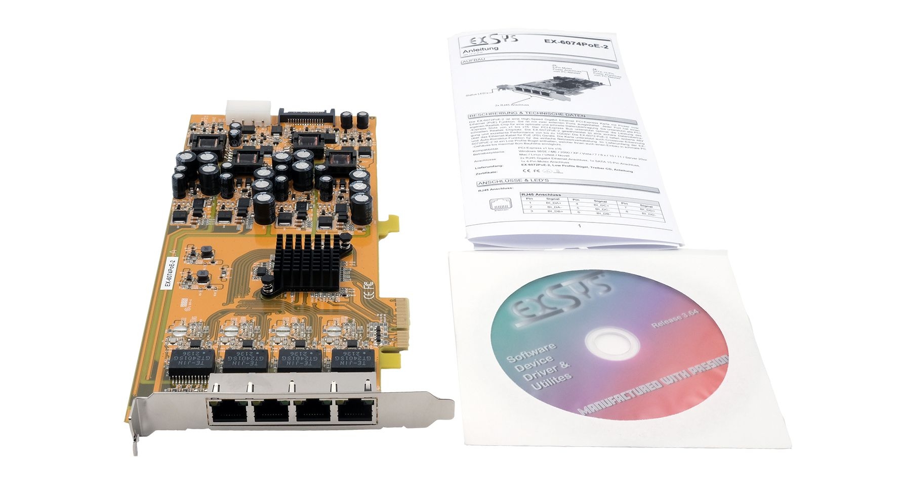 The EX-6074PoE-2 is a fast Quad Gigabit Ethernet PCIe card. It can supply end devices such as IP telephones, IP cameras or WLAN access points with a voltage of 48VDC via the network cable. Thus, the end devices do not require additional power sockets or expensive switches that support PoE. The EX-6074PoE-2 is a cost-effective solution with a maximum power of 34.20 W and a maximum data transfer rate of 1000 Mbps. The various end devices can be supplied with power directly via the data lines. This saves costs and you increase the flexibility where the end devices are installed. The EX-6074PoE-2 supports Half and Full Duplex as well as Nway Auto-Negotiation to automatically adapt to the speed in the network (10/100/1000 Mbit/sec.). Furthermore, the card is equipped with Auto-MDI/MDI-X.