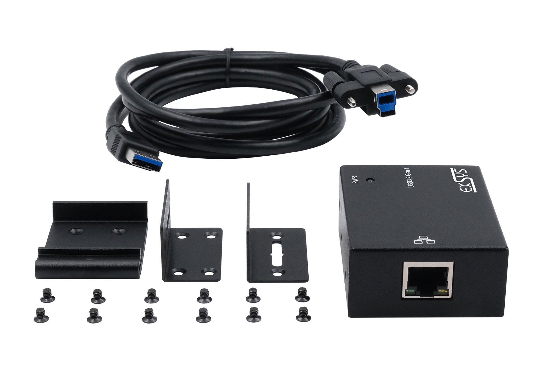 EX-13021HMV, USB 3.2 Gen 1 cable (screw-lock), wall mounting bracket, DIN-Rail kit, manual