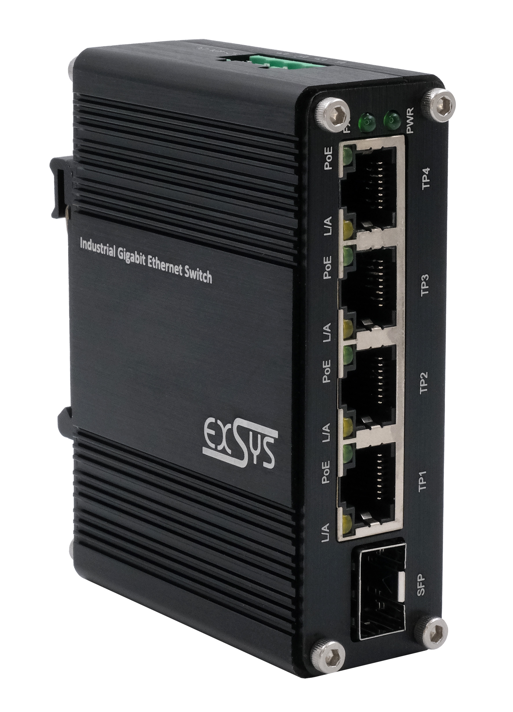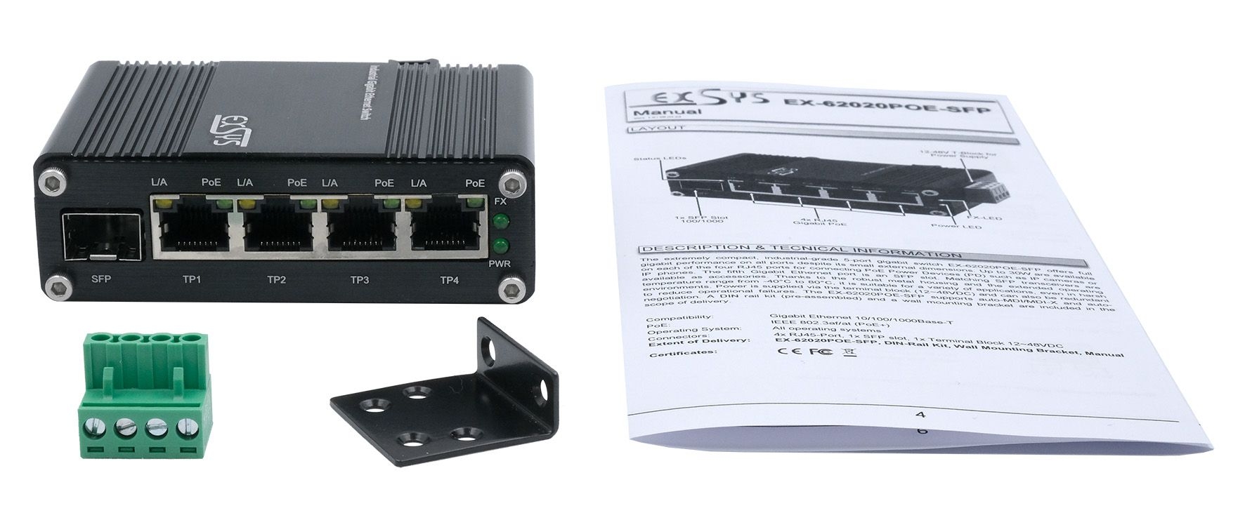 Der äusserst kompakte industrietaugliche 5-Port Gigabit Switch EX-62020POE-SFP bietet trotz seiner geringen Aussenmaße volle Gigabit Leistung an allen Ports. An den vier RJ45-Ports stehen jeweils bis zu 30W für den Anschluss von PoE Power Devices (PD) wie z.B. IP-Kameras oder IP-Telefone zur Verfügung. Der fünfte Gigabit Port ist ein SFP-Slot. Passende SFP-Transceiver sind als Zubehör erhältlich. Dank dem robusten Metallgehäuse und dem erweiterten Betriebstemperaturbereich von -40°C bis 80°C ist er für eine Vielzahl von Anwendungen auch in rauen Umgebungen geeignet. Die Stromversorgung erfolgt über den Terminal Block (12~48VDC) und kann zur Verminderungen von Betriebsausfällen auch redundant erfolgen. Im Lieferumfang ist ein DIN-Rail Kit (vormontiert) und ein Wandmontagebügel enthalten.