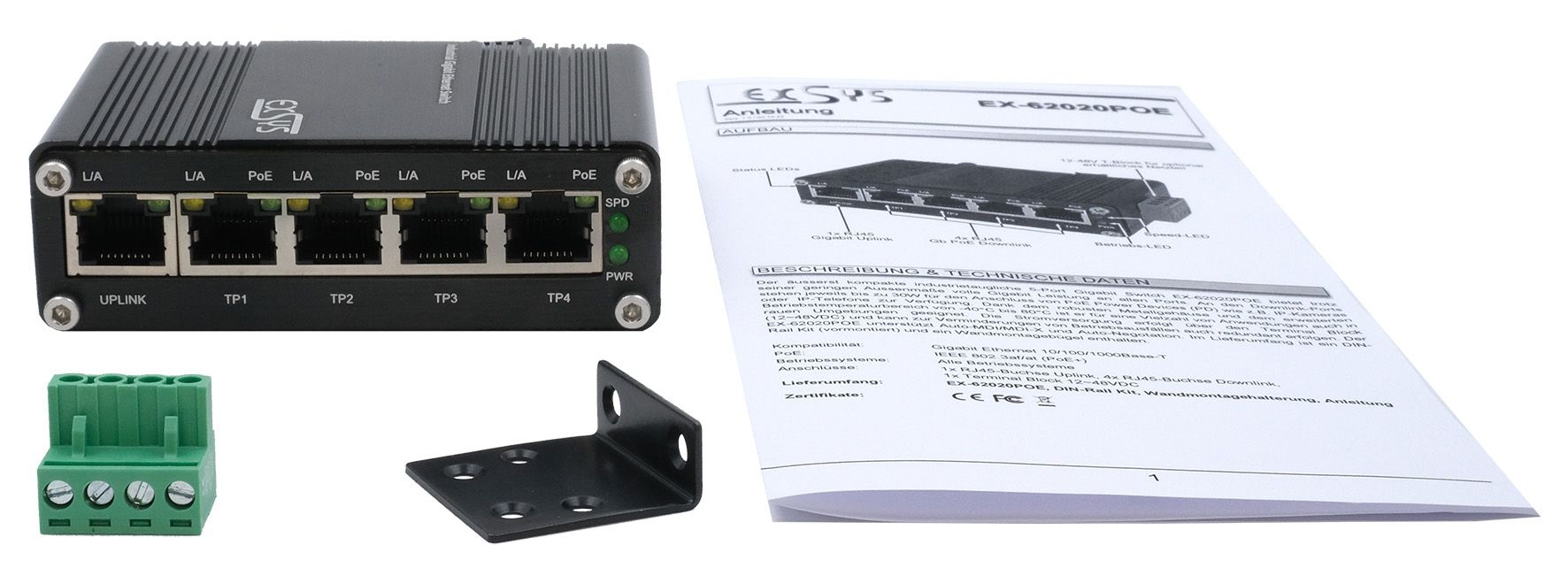 EX-62020PoE, DIN-Rail Kit (vormontiert), Wandmontage Kit, Handbuch