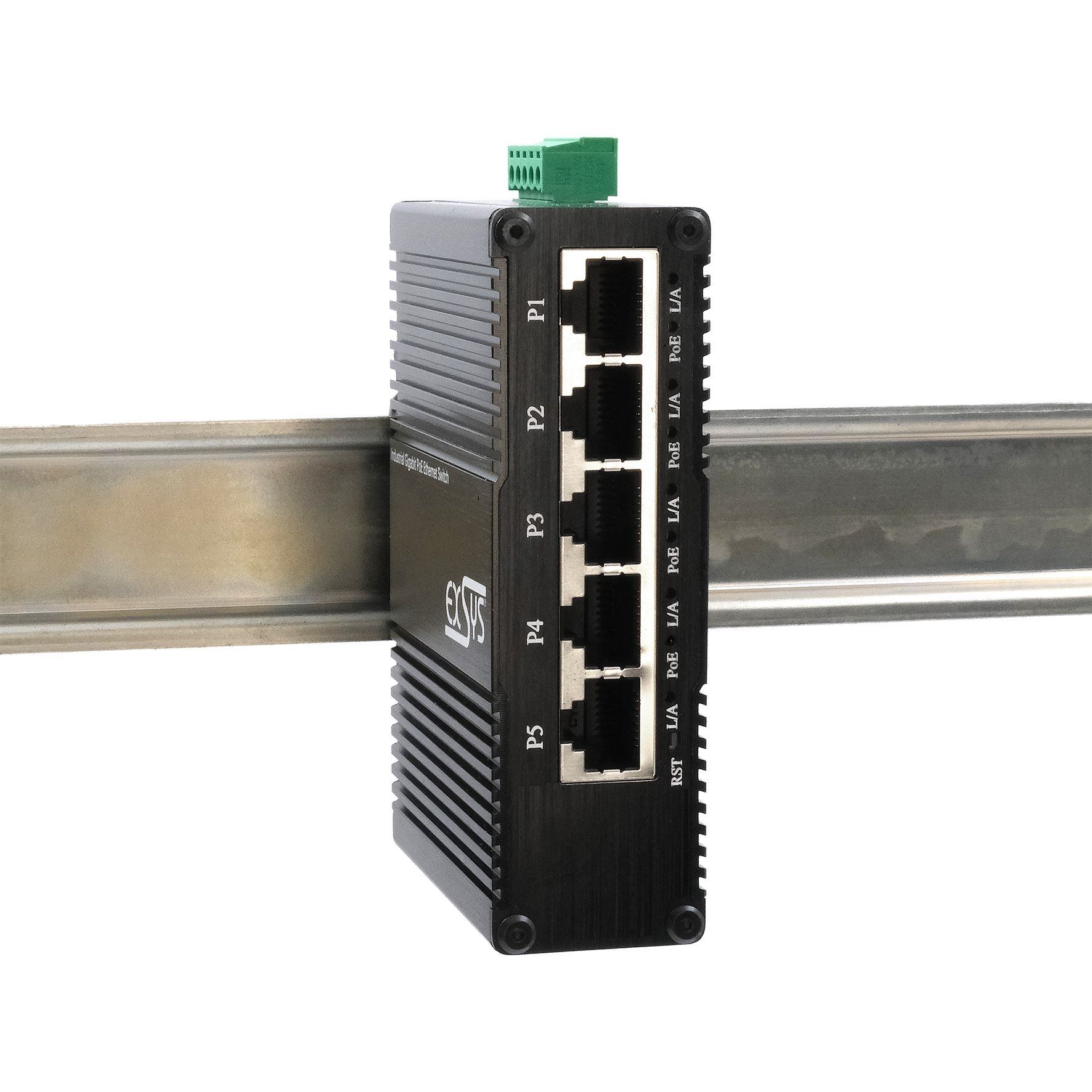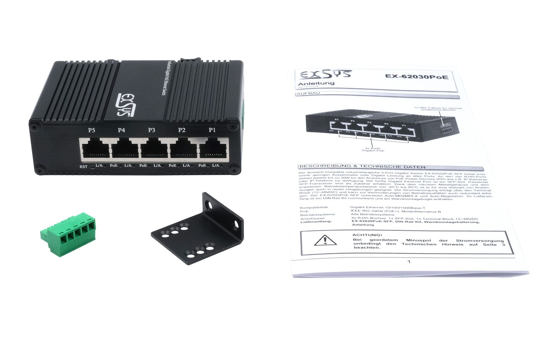 Der kompakte industrietaugliche 5-Port Gigabit Web-Managed PoE-Switch EX-62030MPoE bietet trotz seiner geringen Aussenmaße volle Gigabit Leistung an allen Ports. An vier der fünf RJ45-Ports stehen jeweils bis zu 30W für den Anschluss von PoE Powered Devices (PD) wie z.B. IP-Kameras oder IP-Telefone zur Verfügung. Die benutzerfreundliche Web-basierte Management-Benutzeroberfläche des EX-62030MPoE ermöglicht eine schnelle und bequeme Einrichtung, Konfiguration und Verwaltung, inklusive Konfigurationssicherungen und Firmware-Upgrades. Dank dem robusten Metallgehäuse und dem erweiterten Betriebstemperaturbereich von -40°C bis 75°C ist er für eine Vielzahl von Anwendungen auch in rauen Umgebungen geeignet. Die Stromversorgung erfolgt über den Terminal Block (12-48VDC) und kann zur Verminderungen von Betriebsausfällen auch redundant erfolgen. Im Lieferumfang ist ein DIN-Rail Kit (vormontiert) und ein Wandmontagebügel enthalten.