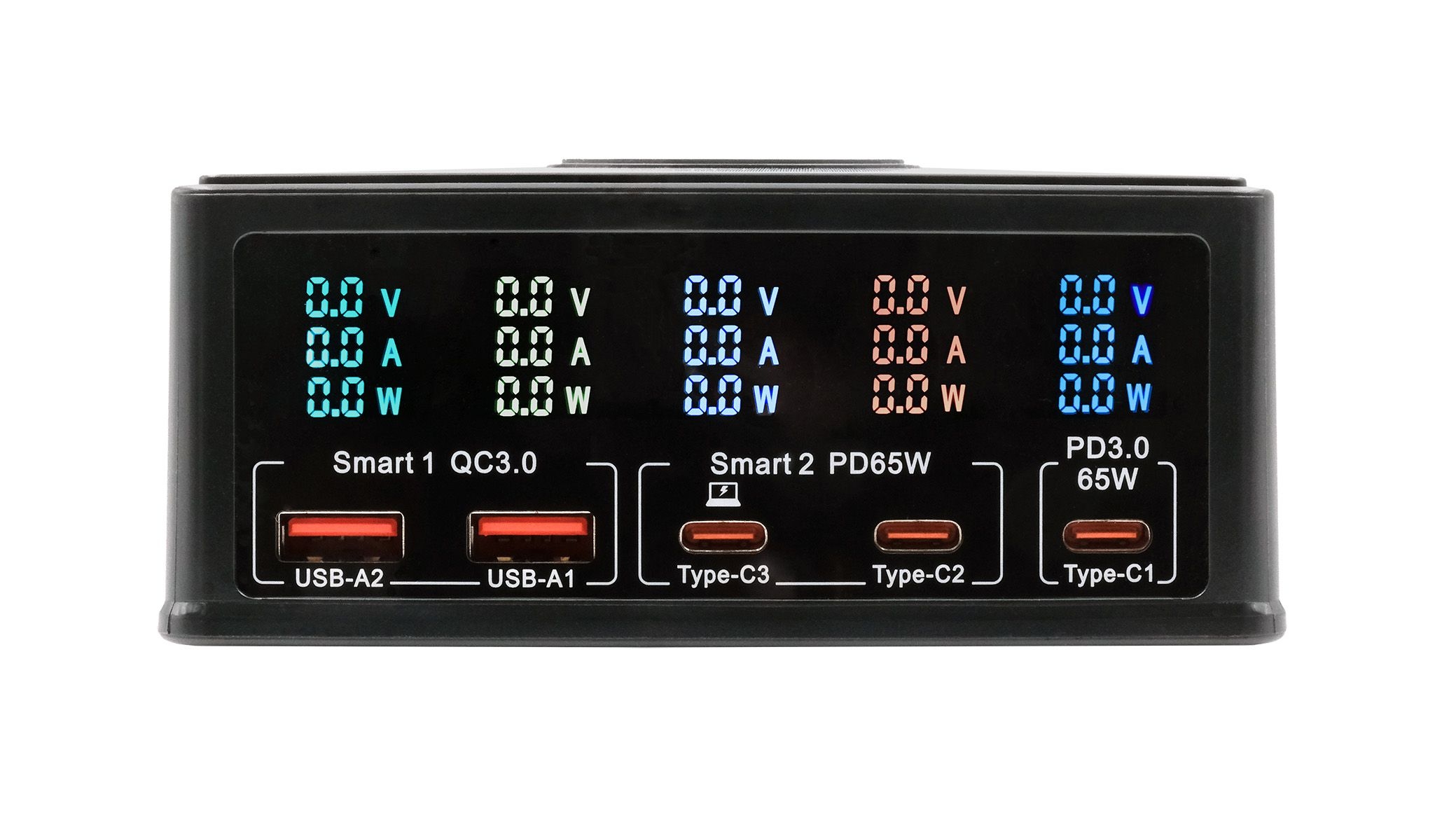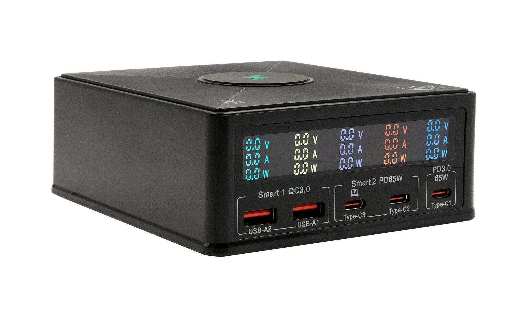 Die EX-1106 ist eine Multiport-Ladestation mit integriertem Wireless Charger und einer Gesamtleistung von 160 W. Sie verfügt über drei USB-C Power Delivery (PD) Ports mit einer Leistung von jeweils max. 65 W zum Laden von Notebooks/MacBooks und zwei Schnellladeanschlüsse für Quick Charge 3.0-kompatible Geräte. Zusätzlich können Qi-kompatible Smartphones, TWC-Headsets etc. auf der Oberseite kabellos aufgeladen werden. Der Clou: Das Display zeigt für jeden Port sowohl Ladespannung, als auch Ladestrom und Ladeleistung an.