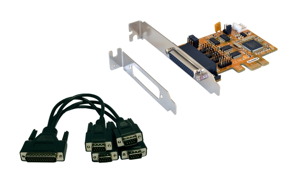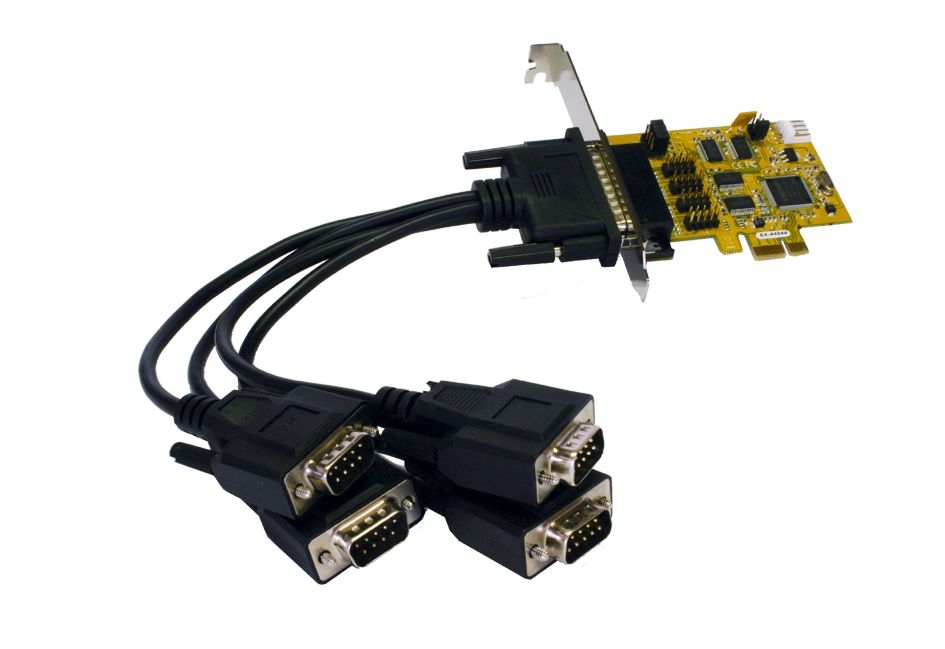 Die EX-44044-2 PCI-Express I/O-Karte stellt vier serielle RS-232 High Perfor-mance UART 16C550 Ausgänge zur Verfügung. Sie wurde entwickelt um vier weitere serielle Ports für PC, Workstation oder Server über den PCI Express Bus zu erweitern. Die Karte ist voll PCI-Express Plug-and-Play kompatibel und hat keine Konflikte mit IRQ und I/O Adressen. Zusätzlich ist +5V oder +12V auf Pin 9 des seriellen Steckers konfigurierbar für ein POS System (Power over System). Mit der EX-44044-2 wird ein Low Profile Bügel mitgeliefert, für schmale Computergehäuse bis 8cm Bauhöhe.