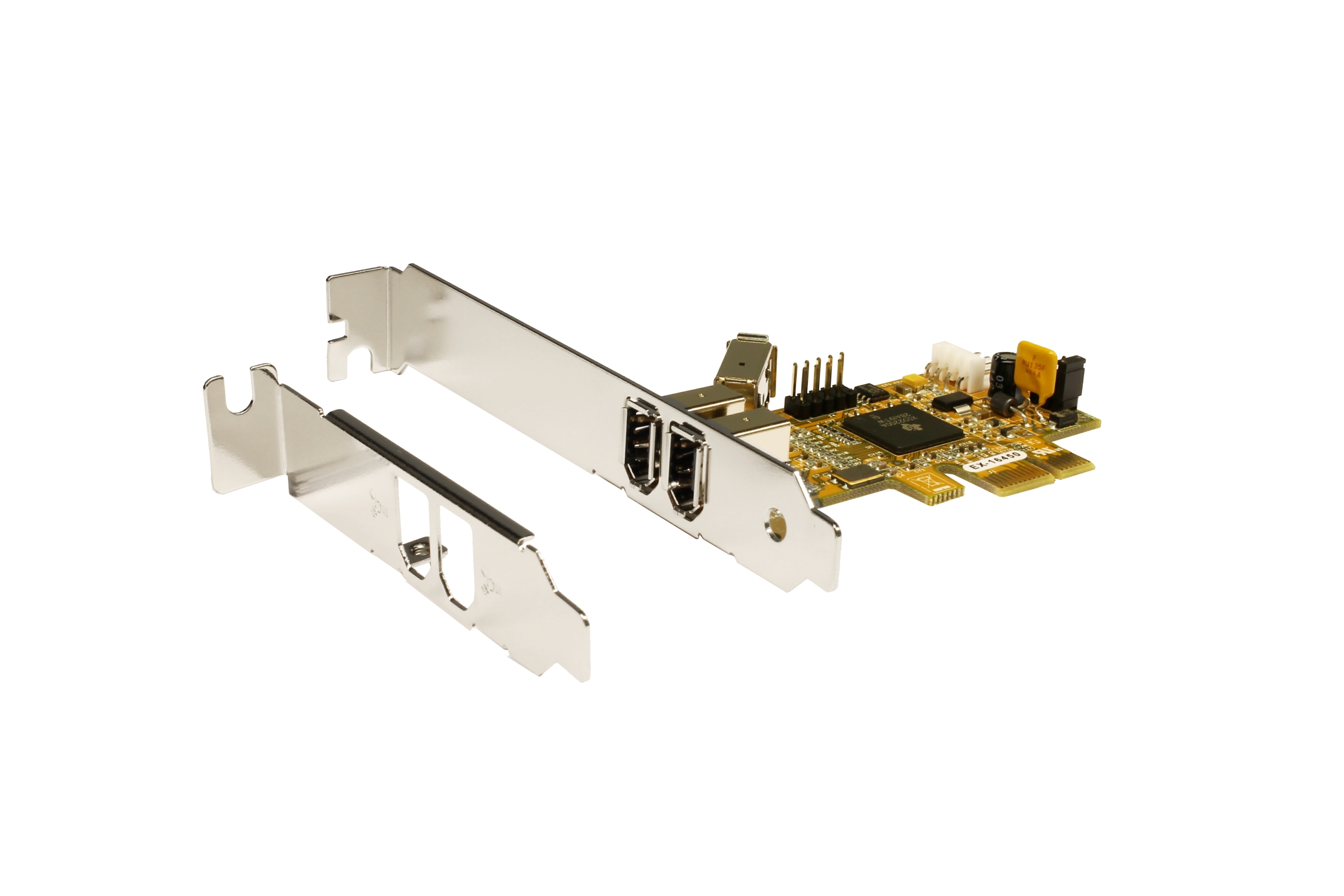 Die PCI-Express FireWire 1394A (FireWire400) Karte stellt zwei externe und einen internen FireWire 1394A Ports zur Verfügung. Er ist entwickelt worden um drei weitere FireWire 1394A High-Speeds Ports für PCs, kleine Workstations oder Server über den PCI-Express Bus zu erweitern um FireWire 1394A Geräte wie zum Beispiel Digitale Video Kameras oder High-Resolution Farb-Drucker anzuschließen. Die EX-16450 stellt eine richtige schnelle I/O Lösung zur Verfügung um dem Anwender die Möglichkeit zu geben schnelle Peripherie-Geräte anzuschließen.Sie beinhaltet zusätzlich einen internen Motherboard kompatiblen Anschluss für FireWire Front Bay HUBs. Mit der EX-16450 wird ein Low Profile Bügel für schmale Computer Gehäuse bis 8 cm Bauhöhe mitgeliefert.