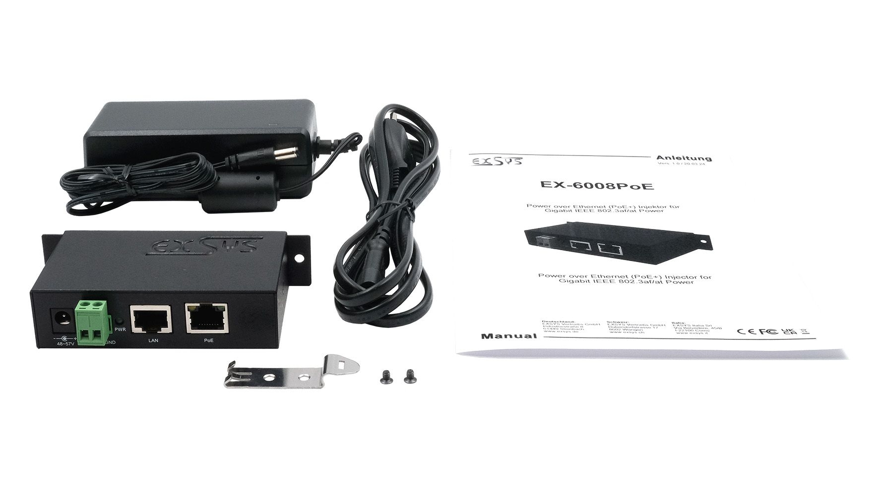 EX-6008PoE, Netzadapter 56V/1.17A, DIN-Rail Kit, Handbuch