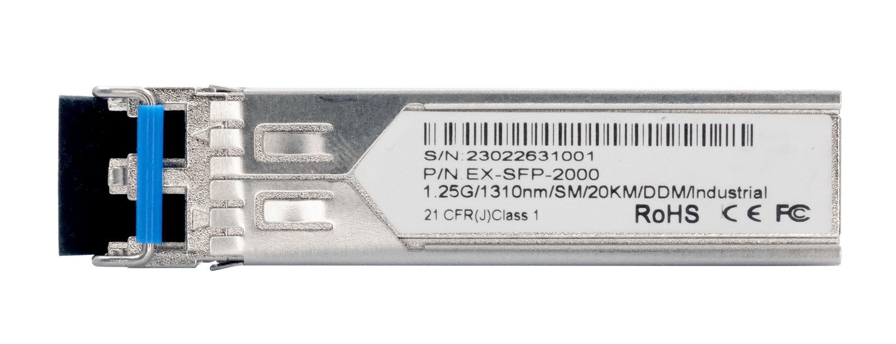 Der EX-SFP-2000 SFP-Transceiver ist ein hochleistungsfähiges, kostengünstiges Modul mit einer Datenrate von 1.25 Gbps und einer Übertragungsdistanz von bis zu 20 km über Singlemode Faser. Der Transceiver besteht aus drei Teilen: einem Fabry-Pérot (FP) Lasersender, einer PIN-Photodiode, die mit einem Transimpedanz-Vorverstärker (TIA) integriert ist, und einer MCU-Steuereinheit. Alle Module erfüllen die Anforderungen der Lasersicherheitsklasse I. Die Transceiver sind mit SFP Multi-Source Agreement (MSA) und SFF-8472 kompatibel.