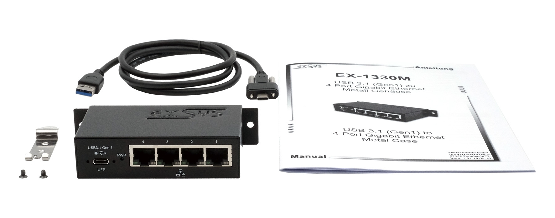 Mit der EX-1330M können Sie Windows, Linux oder MAC Rechner/Notebook über den USB 3.2 Gen 1 Ausgang, gleichzeitig in vier 10/100/1000Mbps Netzwerke einbinden. Die EX-1330M kann gleichzeitig zu einer bestehender Netzwerkkarte installiert werden und stellt vier zusätzlich 1Gigabit Ausgänge zur Verfügung. Die Installation ist sehr einfach ohne, dass die Systeme geöffnet werden müssen. Die Ausgänge können einzeln ein- sowie ausgeschaltet werden. Die EX-1330M hat ein kompaktes Metallgehäuse mit DIN-Rail Kit zur Befestigung in ein 19-Zoll Rack.