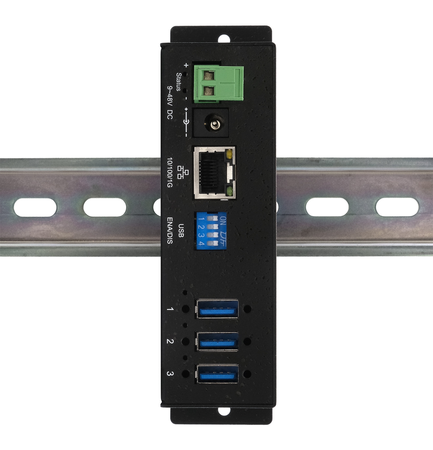 - Robustes Metallgehäuse mit Wand- und Hutschienenmontage (DIN-Rail)